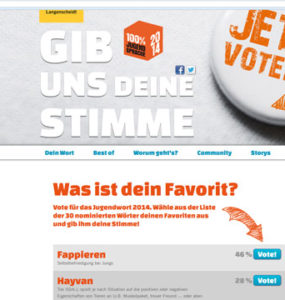Der Ausdruck setzte sich durch gegen „Gönn Dir!“ (frei übersetzt „Viel Spaß dabei“) und das aus dem Türkischen stammende „Hayvan!“ (eigentlich „“Tier“, abgewandelt zu „Freund“, „Muskelpaket“, aber auch „triebgesteuert“). Auch im Rennen waren das allgegenwärtige „Selfie“ (Selbstporträt) und „Senfautomat“ („Klugscheißer“).